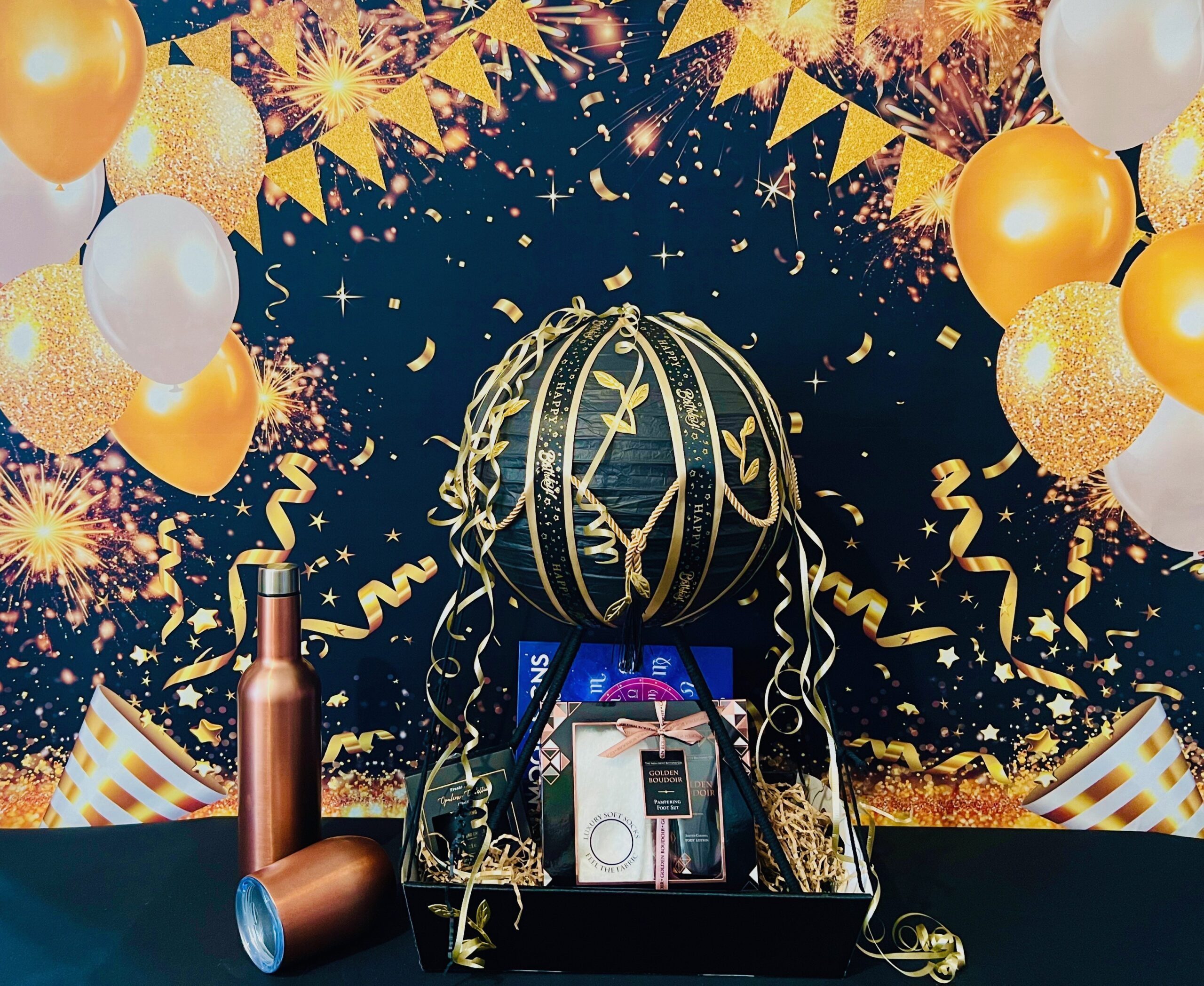 Celebrate her birthday in style with our Sexy in Black Luxury Gift Basket. Filled with a wine bottle cooler, double-walled wine bottle, moon sign book, luxury travel set, pampering foot set, wine tumbler, and candle, it’s the perfect birthday gift for a touch of elegance and indulgence. Beautifully gift-wrapped and delivered to Yeppoon and Rockhampton.